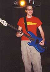 I play a Custom bass I designed myself, I really liked the ernie ball basses, but they were too expensive to buy lefty($1400). So I bought the neck and body from Warmoth Guitars and had a friend of mine put it together for me. As for other equiptment I use, Ampeg SVT 350 head, Ampeg SVT classic half stack. I also have an ernie ball wah pedal, and an electro-harmonics bass synth. Yeah, I play in a band, Who Stands?. We have a three song demo out right now, and we are working on finishing our first album right now, hopefully it will be out in June. I started playing bass two years ago, from scratch. My friends wanted to start a band and couldn't find a bass player, so I picked it up. |