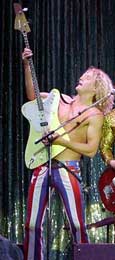 I met Stig Pedersen in Osnabrück on October, 9th,.2000. I read about Stig a long time before and it was my wish to meet him. He´s the bass player of the Band D-A-D (Disneyland After Dark) und a nice guy. Stig said: "Hey, I´m a showmen!" That´s the reason why Stig use a lot a crasy lefthand-basses. If you are intrested in checking out his instruments, please take a look at my "meetings". Stig used on this tour in 2000 a in-ear-system. He played over a rack, just in the PA-system. |
